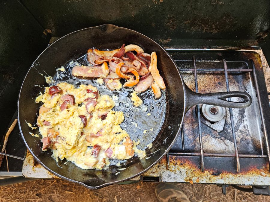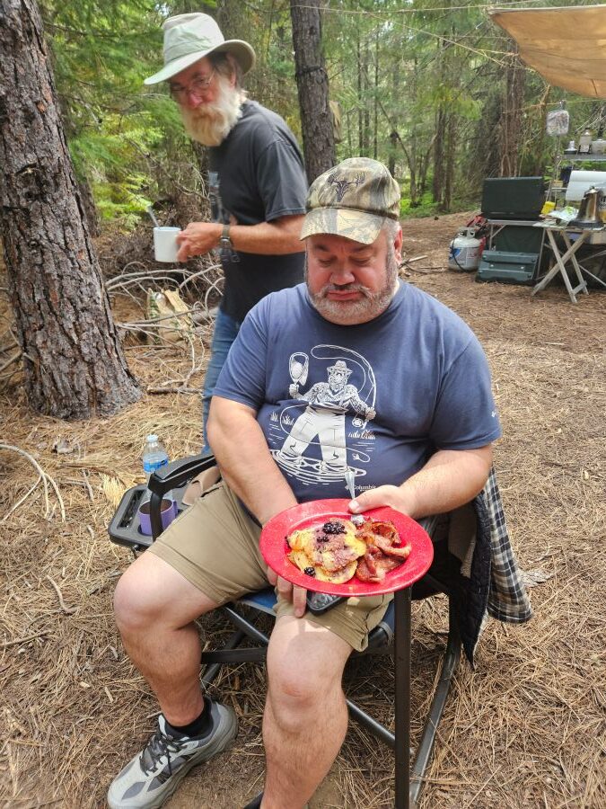 Suddenly realizing we were hungry, we retraced our steps to camp for a repast of bacon, eggs, and fried chicken of the woods.