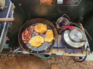 Following a short thrash through the undergrowth, we did indeed find the road and soon arrived in camp. It was nearly noon by the time we got back. We were hungry campers so I set about making pancakes, stirring up a cornmeal batter and boiling down some blackberries with brown sugar and water to make syrup. We had breakfast for lunch.