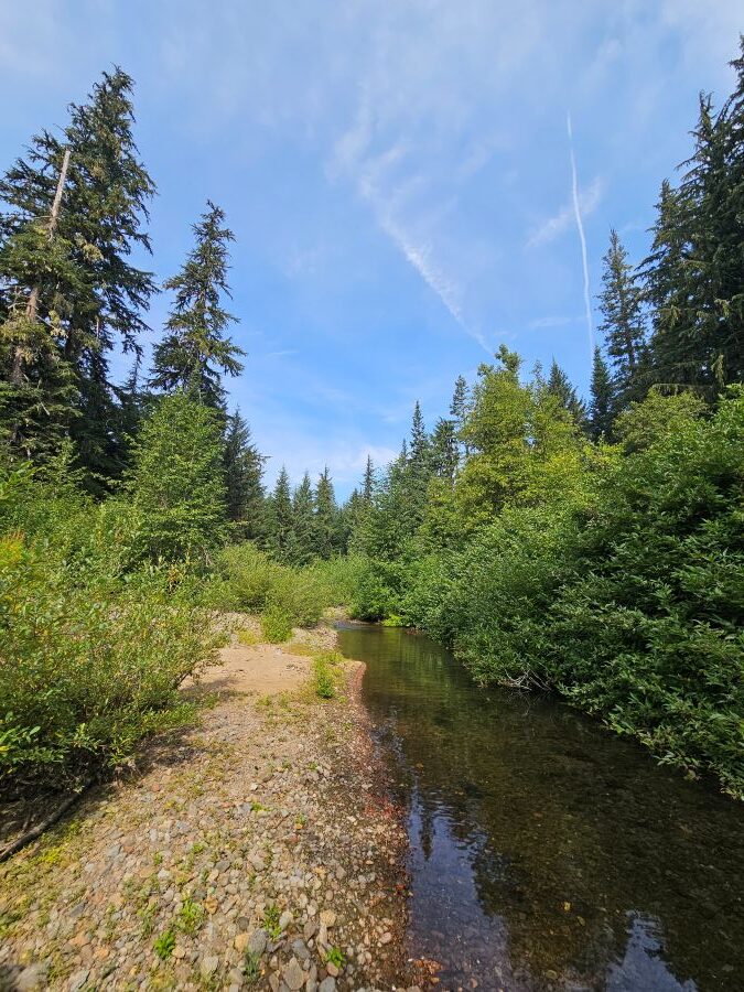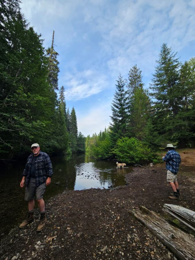We found the vacant campsite just as we had abandoned it several years ago: the poles stacked in the meadow, a pile of firewood covered with bark to shield it from rain, everything in readiness for our return. Next we pushed through the salmon berry thickets to the creek, where Walter enjoyed splashing in the water and cooling off.