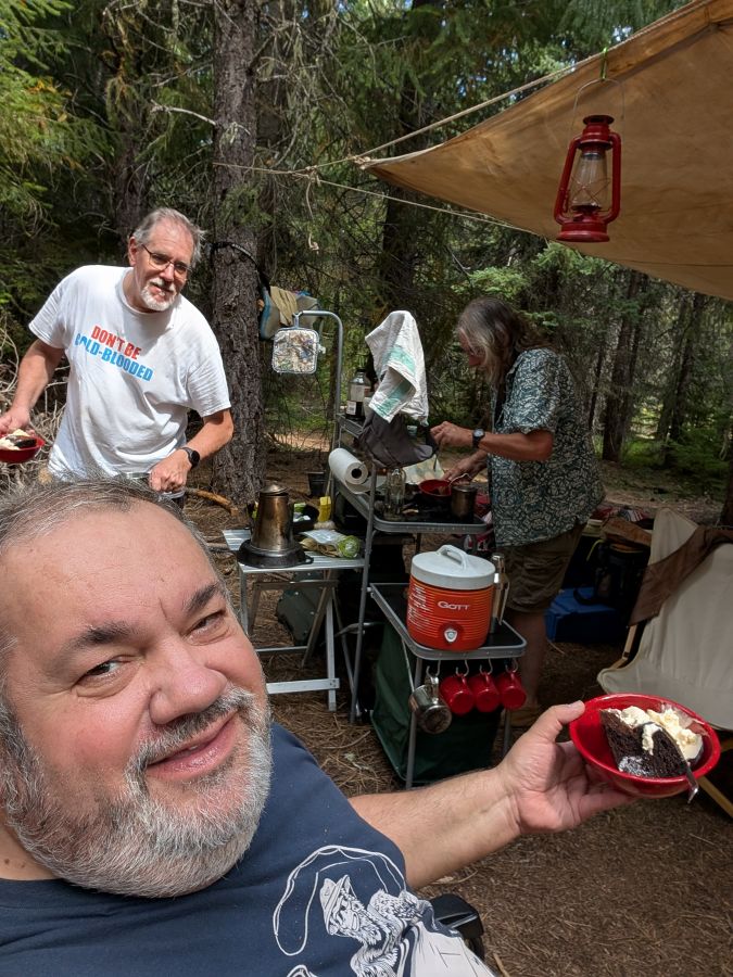 The temperature had climbed to 94F (34.4C), so we finished off the ice cream and cake. After our snack Jason started taking down his lodge. Work beckoned on Monday, and he wanted to get home to spend some time with his wife.