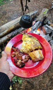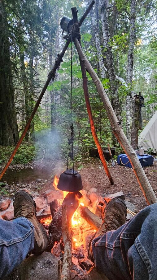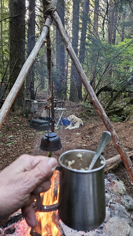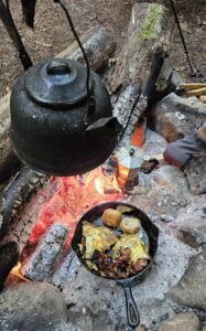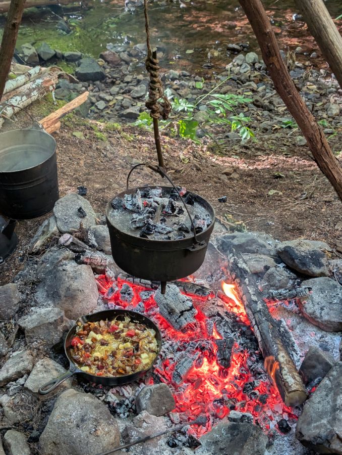 We put the rest of the garlic bread in the Dutch oven to warm and hung a pot of split pea soup over the flames.
